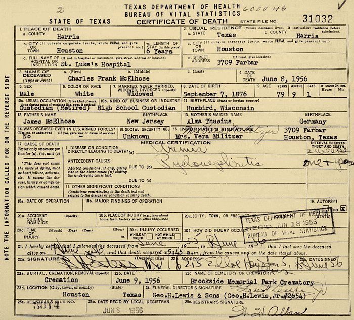 Death Date 08 Jun 1956; Houston, Harris, Texas, United States