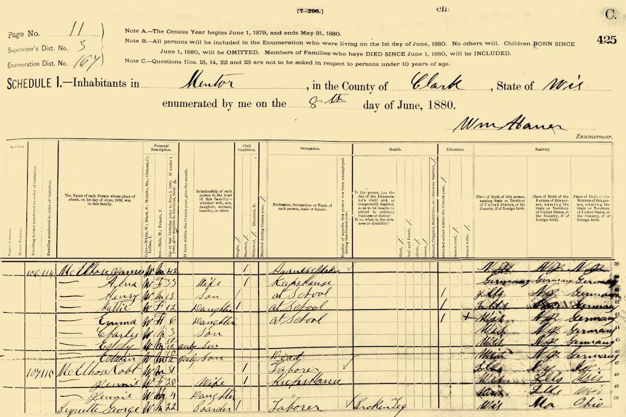 d. 15 Dec 1899 in MN) Robert Densmore McElhose (1849 - 1930) 1880 Federal Census, Mentor, Clark, Wisconsin Edwin McElhose Male 0 Single White Son 1880