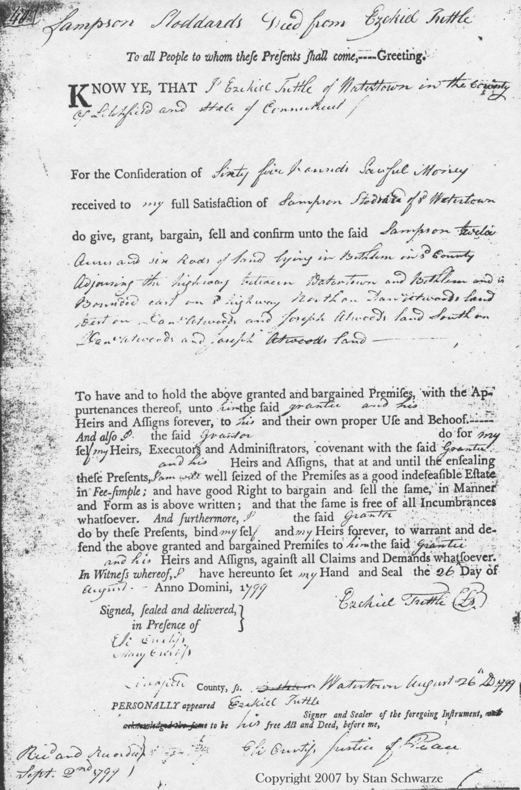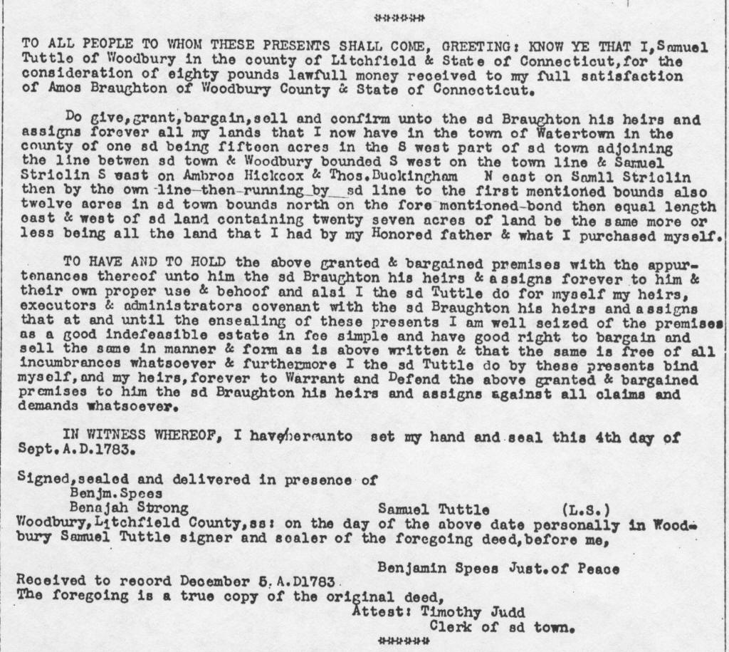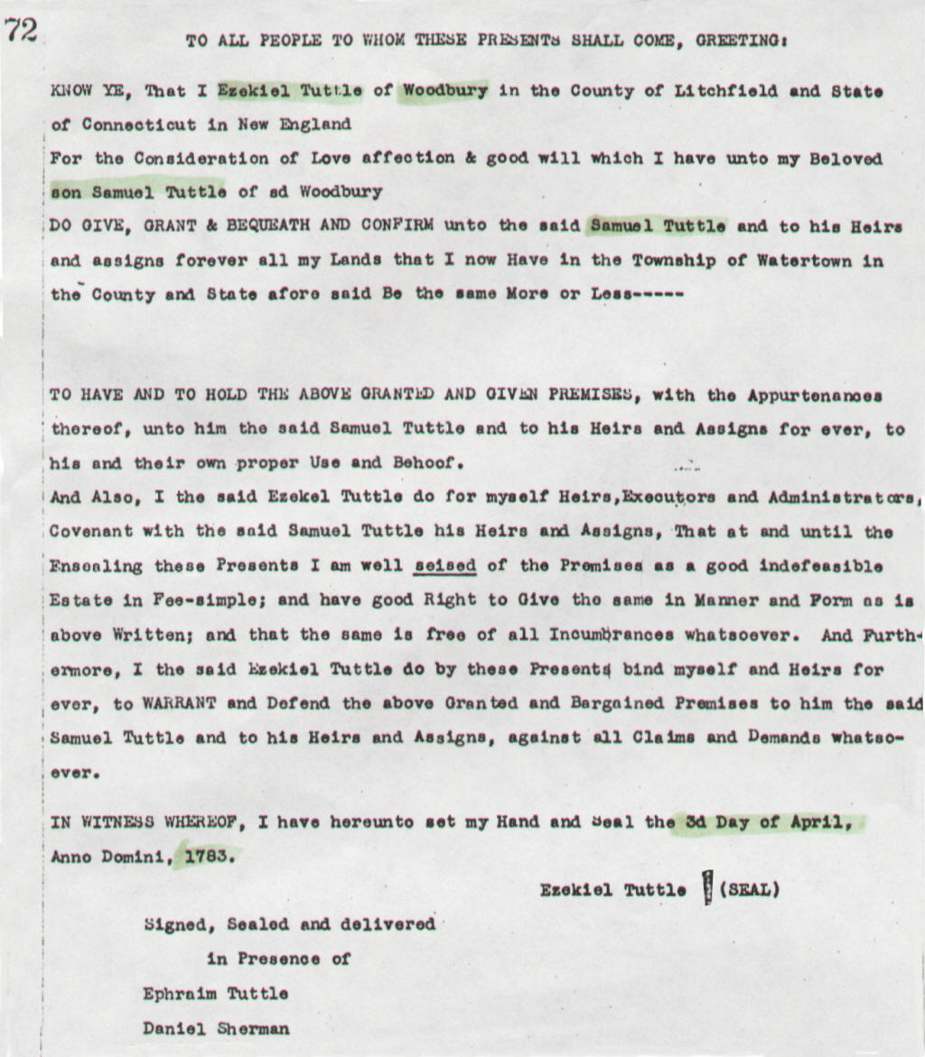 Sources: Schwarze Family Records, legal documents from Bethlehem, CT; Woodbury, CT; New Haven, CT, Waterbury, CT & Watertown, CT; Tuttle Family Histories; Connecticut Town Birth Records pre-1870, the Barbour Collection, citing Woodbury vital records volume LR6, page 2 (birth date for Samuel Tuttle, supplied by Linda Mottonen) , Jim Tuttle Family History, Dorothy Johnson Burgraff's collection (contributed by Sharon Scott).
