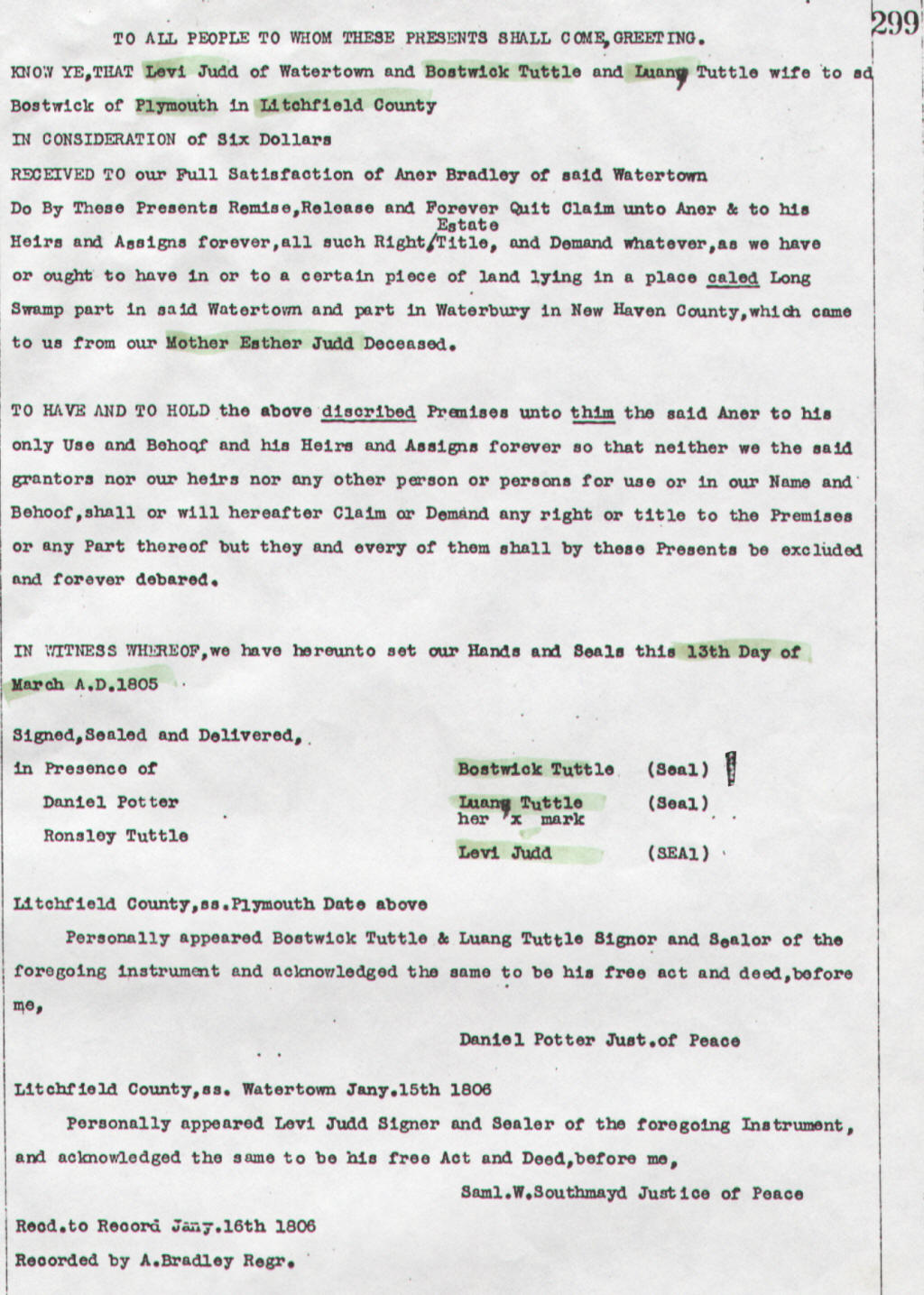 Luania Judd 19 Mar 1769, d. ??, married Bostwick Tuttle.