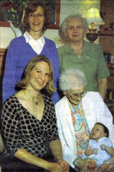Five generations of first-born girls got together on Mother’s Day of this year. They are: (standing, from left) Charlene Dascher, grandmother; Charlotte Jacob, great-grandmother; (seated, from left) Jen Prowitz, mother, and Lila Hubing, great-great-grandmother, holding one-month old Olivia Lila Prowitz. (Contributed photo) |