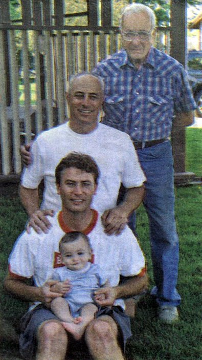 Four generations of the Pischer family gathered together on Father’s Day, June 17. Pictured (from bottom up) are Hudson Pischer, age eight months; father, Jason Pischer, Redondo Beach, Calif.; grandfather, Ken Pischer, San Anselmo, Calif. and great-grandfather, Harvey Pischer, Neillsville. (Contributed photo) |