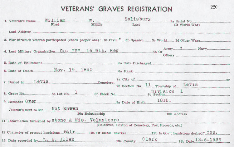 Township Cemetery, Clark Co., Wisconsin. SALISBURY family Benjamin Bacon Crockett