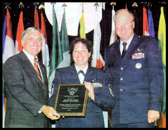First Sergeant Alice Sischo (center) was presented the 2007 George W. Bush Outstanding Employees Supporting Traditional Air National Guard Members award at the Air Force Association (AFA) convention held Oct. 25 in Washington D. C. for her service during Operation Enduring Freedom. Presenting the plaque to Sischo are Bob Largent (left) AFA chairman and Lt. General Craig McKinley. (Contributed photo) |
