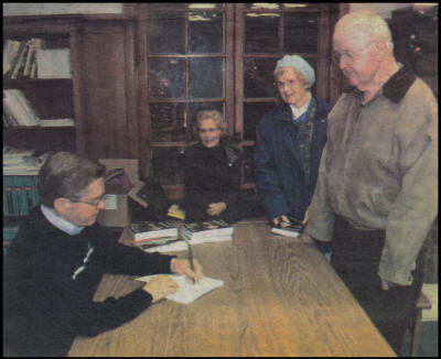 With wife Dorothy (center) sitting nearby, Howie Sturtz signs a copy of his book "Thanks for the Memories" for Lou and Charlie Neff. The book-signing event was held at the Neillsville Public Library last week. |