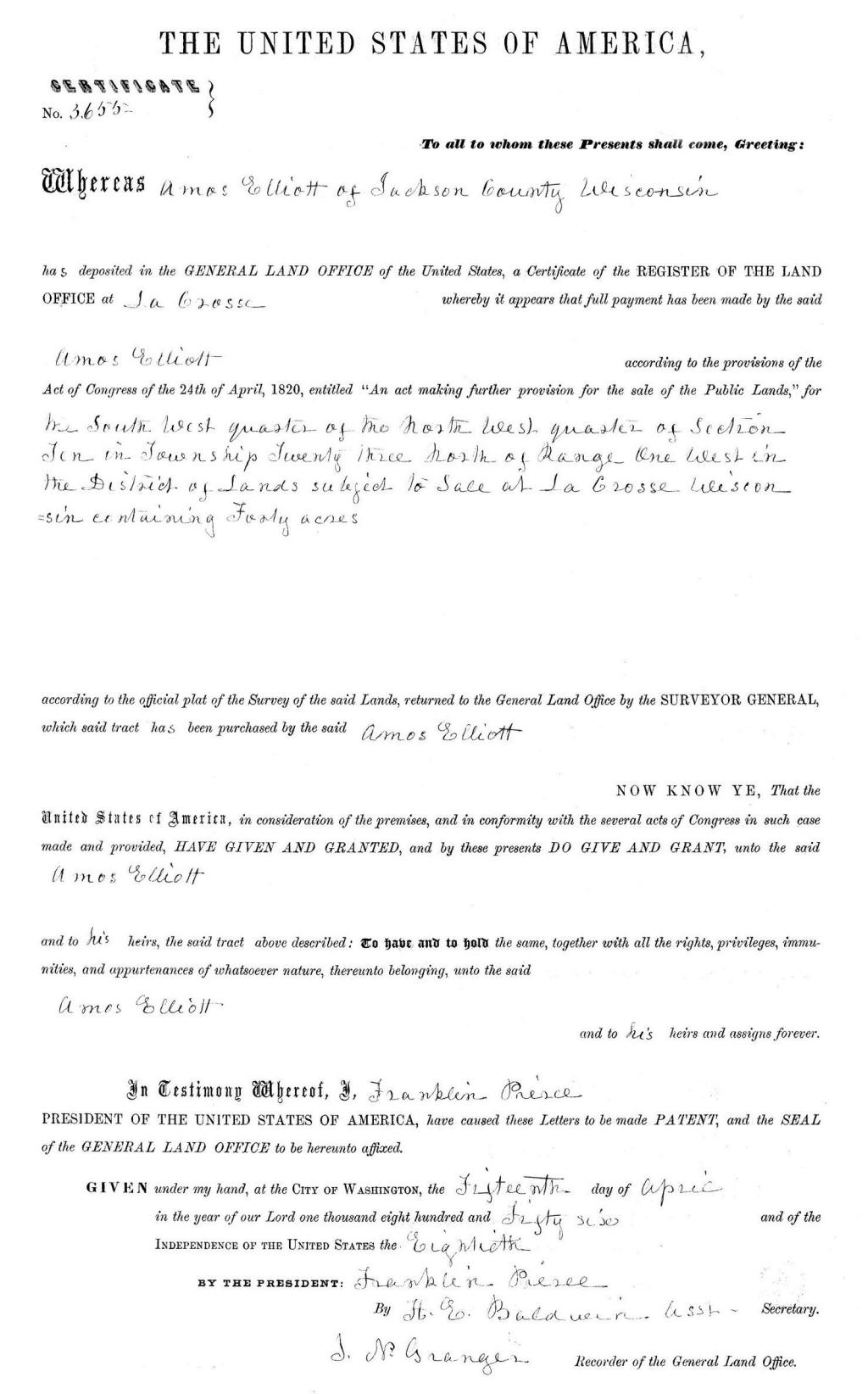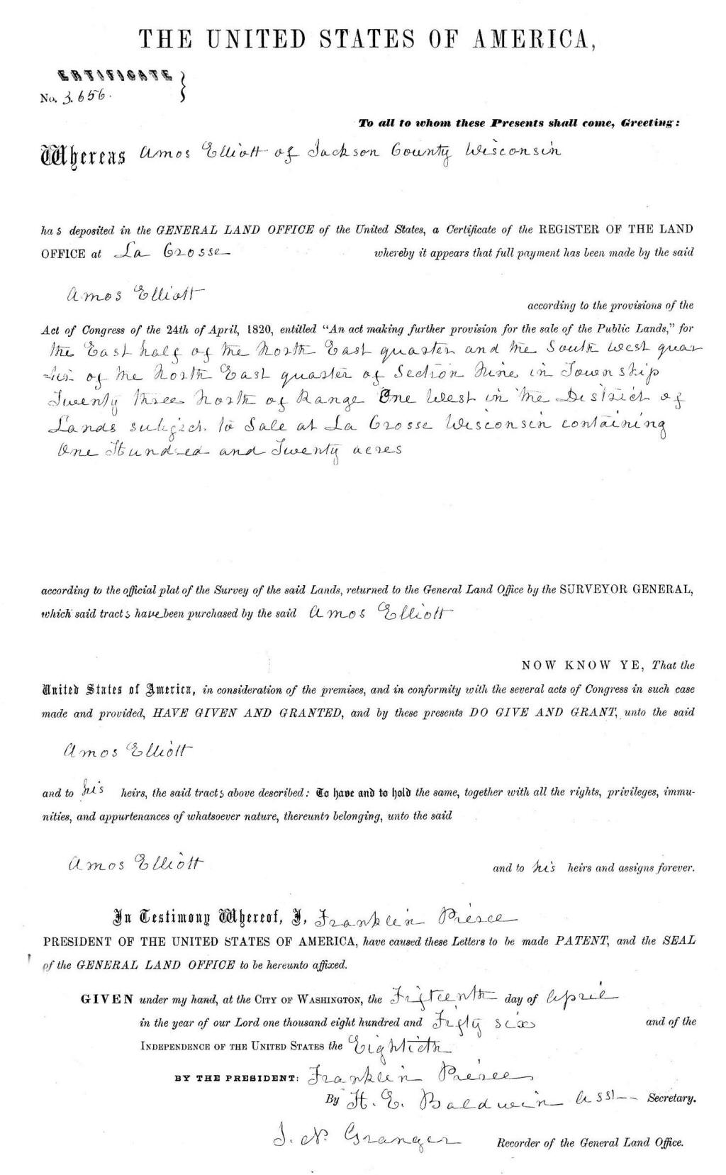 In the spring of 1848, Wisconsin became the 30th state to join the union. That winter, Elliot ran a camp in partnership with W. T. Price, putting in logs on the west side of Black River, four miles above Cawley Creek. These logs were put in for Col. B. F. Johnson.