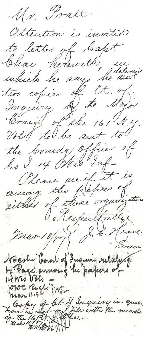 Inquiry which were delivered to Major Craig of the 161st NY Volunteer Infantry