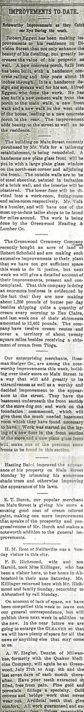 Watch Greenwood Grow Every week improvements are taking place that speaks very favorably for one of the liveliest little cities in the grassland country. No where can there be found a small city that takes more pride in the appearances of its streets and public places, or where the citizens spend more time in the improvements to their properties and the beautifying of their lawns, that they do right here. It is to the apparent and prosperous condition of Greenwood in general, and its sanitary and healthful environments, that is causing people at a distance to set up and take notice. Greenwood Gleaner Aug. 5, 1909