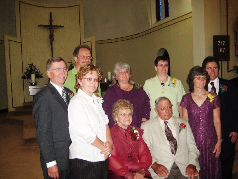 Picture #2: Eileen Hodnett and new husband Vincent "Pete" Lindner (front center). Married in Loyal, Wisconsin on June 28, 2008. Both Eileen and Pete are age 83. Pete is a retired farmer from the Greenwood / Loyal area of Wisconsin. Surrounded by children of Eileen Hodnett from her first marriage to Harold Hodnett. Harold died on May 6, 2006. Children are from Left to Right: Allan (suit), Lynn (green shirt), Lois (white shirt), Karen (center of photo behind Eileen), Kay (green), Nancy (purple), and Larry (suit on far right). Picture was taken in the church immediately following the wedding. Pete and Eileen plan to live in Loyal.