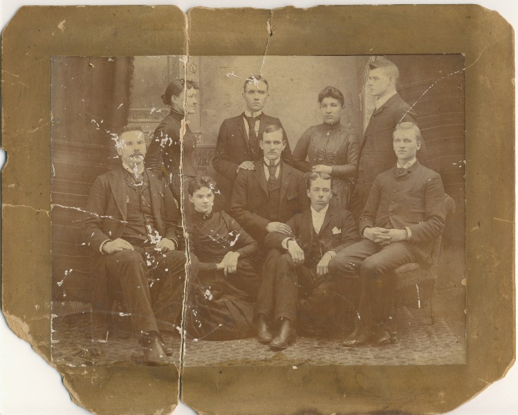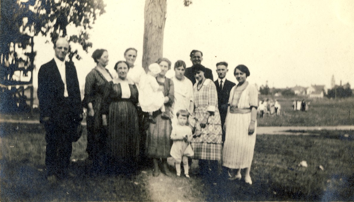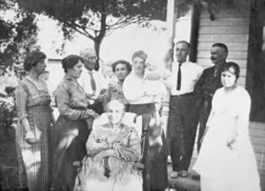 Mary Rossman Moulton is holding Gwendolyn Priddy (born in 1921). Gwendolyn is same Gwendolyn said to be daughter of Ira and Nora Rossman. Gwen was adopted by them. Theodore Priddy standing in front of Mary. He was born Marshall Theodore Priddy in 1920. Mary's daughter Marion is on the end of the right side. Lucy is first woman on the left side. |