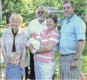 Above, (l-r), are Doris with great-great-grandson, Beau Oldham; Doris’ oldest son, Arne Eisentraut; granddaughter Dixie Oldham holding Doris’ great-great-granddaughter, Lexie Oldham; and great-grandson, John Oldham.