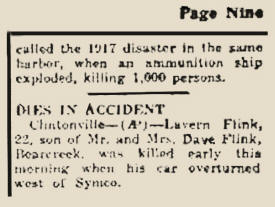 Clintonville - (AP) - Lavern Flink, 22, son of Mr. and Mrs. Dave Flink, Bearcreek, was killed early this morning when his car overturned west of Symco.
