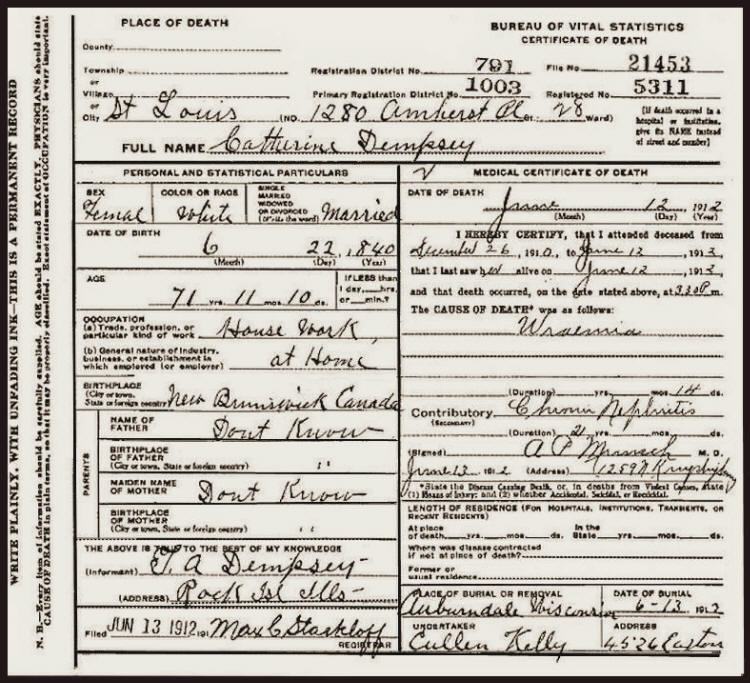 Death Certificate for Catherine Dempsey