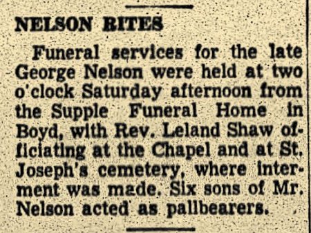 Funeral services for the late George Nelson were held at two o'clock Saturday afternoon from the Supple Funeral Home in Boyd, Wisconsin with Rev. Leland Shaw officiating at the Chapel and at St. Joseph's cemetery, where interment was made. Six sons of Mr. Nelson acted as pallbearers. (Spouse: Cordelia Ripplinger Nelson 1890–1952 (m. 1911)