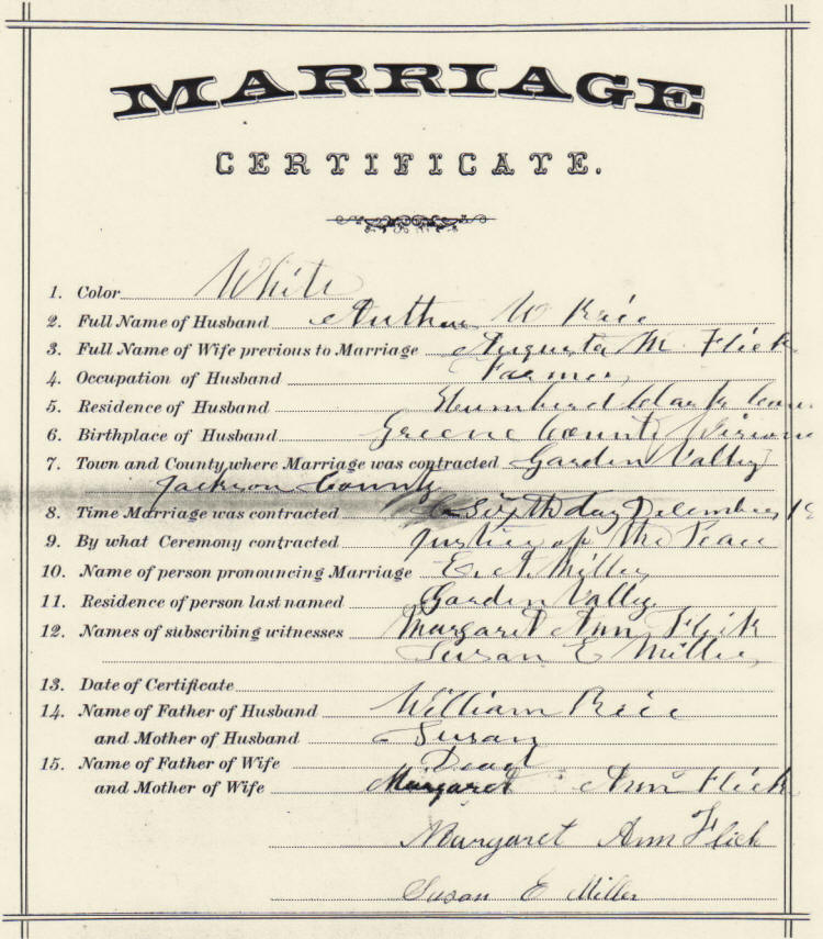 1. Augusta Malvina FLICK b: 25 MAY 1852 in ,Clarion, Pennsylvania