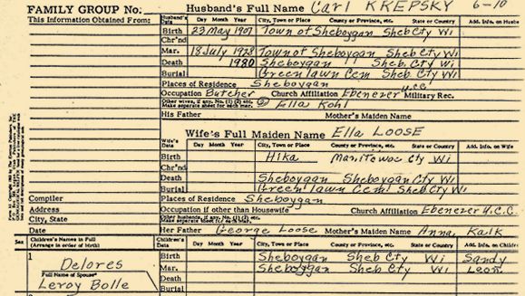 (1) Carl Married Ella Loose of Centerville, Wisconsin, 18 Jul 1928. She resided at 1337 Martin Ave. and was born 4 Mar 1906. They named their daughter, Delores, and she married LeRoy Bolle.