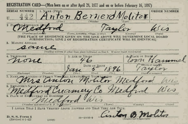 Draft Card for Anton Bernerd/Bernard Molitar (father of James)