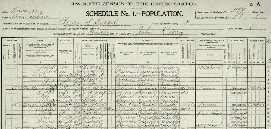 1900 Federal Census, Cassel, Marathon, Wisconsin