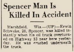 Marshfield, Wis. - UP. Erwin Schweke, 26, Spencer, was killed instantly when his oil truck overturned on Highway 13 near here yesterday. He was crushed underneath the truck.