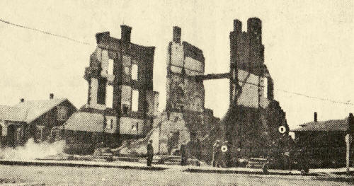 Picture transcription: Loyal old-timers still can remember the fire that destroyed their last three-story building, Allan Block, 50 years ago. The building, above, was built by G.W. Allen. He bought the land in 1880 and built a hotel in preparation for the expected construction the Chicago, Milwaukee and St. Paul Railroad to Loyal. Below is a scene of the building’s remains after the March 28, 1931, fire killed four persons. The Kehrberg Store now stands where the Allen Block was located.