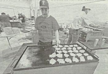 A Volunteer pours batter for potato pancakes during the June 25 Greenwood Dairy