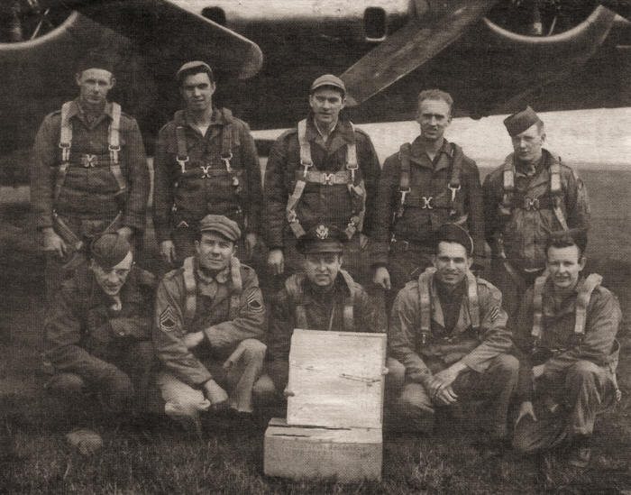 Frank Zank (kneeling, fourth from left) and other members of the 383rd Fighter Squadron, 364th