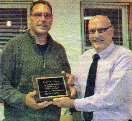 Mayor Steve Mabie (r) presents Ward 2 Alderman Joseph Weiers with a plaque of