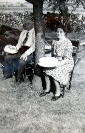 Frank BEYERL's birthday in 1948, likely on his front lawn, both Frank and Elizabeth [KLAWINSKI] BEYERL pictured. |