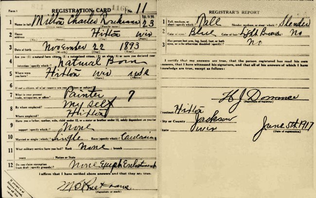 Milton Charles Rosekrans, single, 23 yrs. old (22 Nov 1893), residing in Hixton Twp., WI.