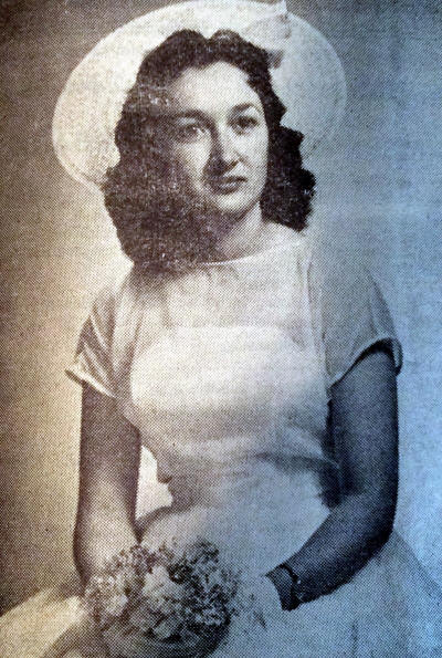 a Sabrina neckline and full skirt. She wore a white picture hat and a corsage of