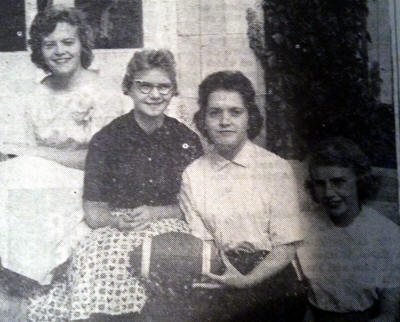 Here is the 1959 Greenwood High School Homecoming Queen's Court elected frofm each class. Seated from top to bottom are Donna Auman, senior, daughter of Mr. and Mrs. Felix Auman, R. 2, Greenwood (Clark Co., Wis.); Alice Lindner, junior, daughter of Mr. and Mrs. John Linder, Greenwood; Bernardine Koschak, sophomore, daughter of Mr. and Mrs. Ignatius Koschak, Greenwood; and Bonnie Anderson, freshman, daughter of Mr. and Mrs. Charles Anderson, R. 1, Willard.