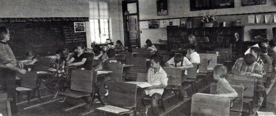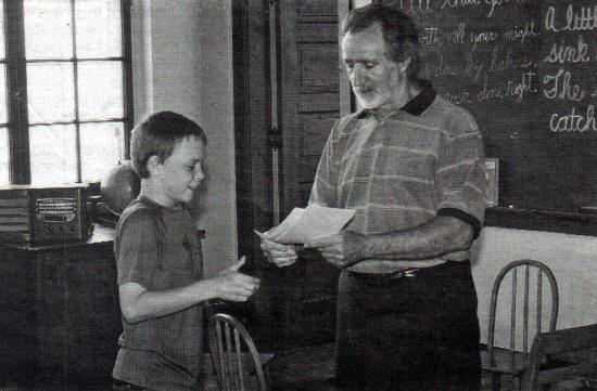 Neillsville Elementary School fourth-grade students experienced a day in a one -room school during field trips last week to the historic Reed School located on USH 10 east of Neillsville. Above, students participate in a group art lesson; below, a happy student receives his “diploma” from the teacher for completing the course-work assignments. (Photos by Todd Schmidt/Clark County Press)