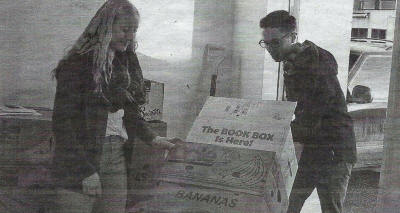 Brady Coulthard and fellow volunteer Ellie Knodle deliver boxes of books to the