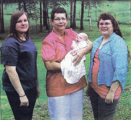 Four Generations: (l-r) Lacey Murphy (mom), Lana Ormond (great-grandma) holding Layden Tlusty and Lacey Frankewicz (grandma). Everybody in the above photo is a first daughter and first granddaughter.