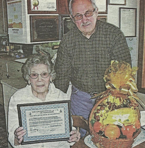 50-year certificate and pin, along with a fruit basket to Anita Lulloff (left)