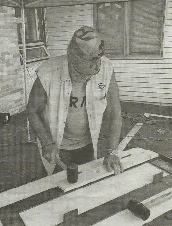 Al Bauman uses a mallet on a board that will eventually be used in a bed for a
