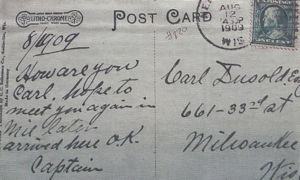 Above is a postcard written to Carl Dusold, Esq. from a “Captain” that the