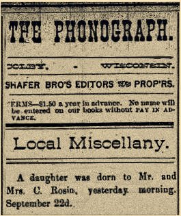 The Colby Phonograph reported the birth of Hortense Rosin Brehm to C (Carl / Charles Rosin) in its 24 Sep 1896 issue.