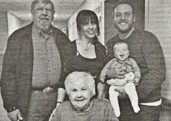 seated) Eleanor Neville of Neillsville, who turned 101 on June 21; (back) Bill