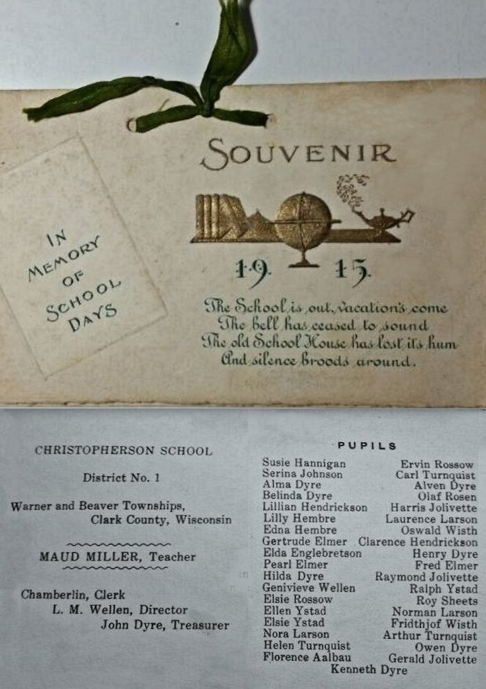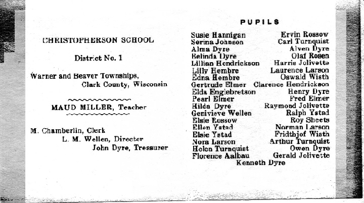 Warner and Beaver Townships, Clark County, Wisconsin ~~~~~~~~ MAUD MILLER, Teacher ~~~~~~~~~ M. Chamberlin, Clerk L. M. Wellen, Director John Dyre, Treasurer PUPILS listed are Susie Hannigan, Serina Johnson, Alma Dyre, Belinda Dyre, Lillian Henrickson, Lilly Hembre, Edna Hembre, Gertrude Elmer, Elda Englebretson, Pearl Elmer, Hilda Dyre, Genivieve Wellen, Elsie Rossow (Milt Ytad’s mother), Ellen Ystad, Elsie Ystad, Nora Larson, Helen Turnquist, Florence Aalbau, Ervin Rossow, Carl Turnquist, Alven Dyre, Olaf Rosen, Harris Jolivette, Laurence Larson, Oswald Wisth, Clarence Hendrickson, Henry Dyre, Fred Elmer, Raymond Jolivette, Ralph Ystad, Roy Sheets, Norman Larson, Fridthjof Wisth, Arthur Turnquist, Owen Dyre, Gerald Jolivette, Kenneth Dyre. |