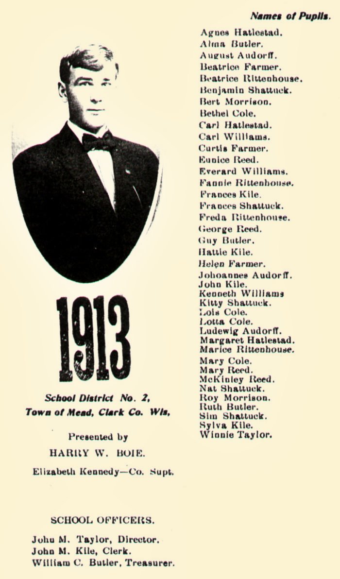 We also found the clip above in the same stack of papers, but do not know where this school was located either. It doesn't seem to list the teacher and we don't know if the picture was a student or not. The students listed are: Audorff, Johoannes; Audorff, Ludewig; Butler, Guy; Butler, Ruth; Cole, Bethel; Cole, Lois; Cole, Lotta; Cole, Mary; Farmer, Beatrice; Farmer, Curtis; Farmer, Helen; Hatlestad, Carl; Hatlestad, Margaret; Kile, Frances; Kile, Hattie; Kile, John; Kile, Syliva; Morrison, Bert; Morrison, Roy; Reed, Eunice; Reed, George; Reed, Mary; Reed, McKinley; Rittenhouse, Beatrice; Rittenhouse, Fannie; Rittenhouse, Freda; Rittenhouse, Marice; Shattuck, Benjamin; Shattuck, Kitty; Shattuck, Nat; Shattuck, Sim; Taylor, Winnie; Williams, Carl; Williams, Everard; Williams, Kenneth.