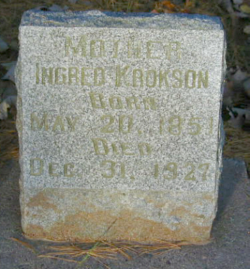to | Krokson, Ingred | 00-B001-07 | 20 May 1851 | 30 Dec 1927 | John Krokson | 1870 | Johnson | Burial 1/3/1928; D. Minneapolis |