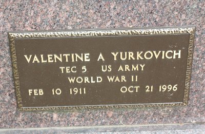 to | Yurkovich, Valentine Anthony; #2 | 01-G008-05 | 10 Feb 1911 | 21 Oct 1996 | Sylvia Jelercic | 7 Dec 1946 | Anthony & Josephine (Podobnik) Yurdovich | WWII - Army; b. Joliet, Ill & d. Marshfield hosp./ |
