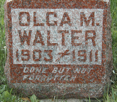 ctn | Weber, Frank | S1-R05-G38 | 19 Nov 1907 | 2 Oct 1911 | 1911 | Stone says B.1906;D.1910 | Single | Louie & Anna (Waseca) Weber | |