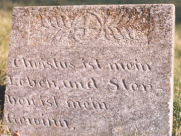 Inscriptions Right (South) Stone: Translation: Christus ist mein Christ is my leben und Ster- life and deathben ist mein is myGewinn. reward.Left (North) Stone: Translation: see verses from The Bible (below) Ich weisz dasz t mein Erlöser le et und er wird mich hernach aus der Erde auferwecken. Martin Luther Version: Hiob 19.25 "Uber ich weisz, dasz mein Erlöser lebet; und er wird mich hernach aus der Erde auferwecken;" Revised Standard Version: Job 19.25 "For I know that my Redeemer lives, and at last he will stand upon the earth;" King James Version: Job 19.25 "For I know that my Redeemer liveth, and that he shall stand at the latter day upon the earth." |