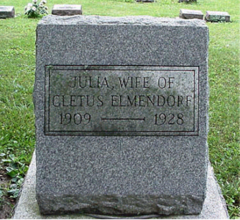 on | Elmendorf, Julia | Row I Lot # 5 | 26 Mar 1908 | 26 Nov1928 | Cletus Elemendorf | 18 Oct 1926 | Robert & Clara (Grhoke?) Robertson | |
