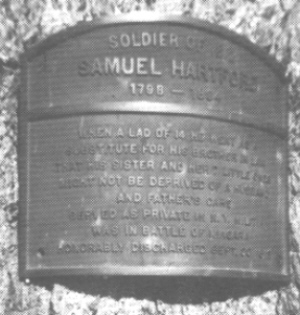On Oct. 4, 1925, a plaque was dedicated to Samuel Hartford, whose grave is just inside the wrought iron gates. He is a veteran of the War of 1812, and is memorialized because as a boy of fourteen he enlisted in place of his brother, who had a wife and seven children.