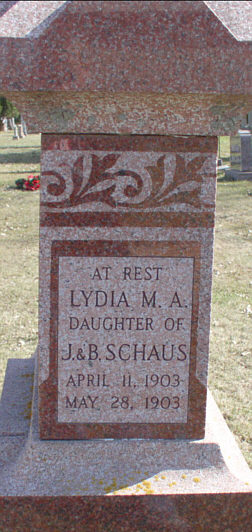 ct | Schaus, Lydia M. A. | OC-25-05 | 11-Apr-1903 | 28-May-1903 | Daughter of J&B Schaus | |||