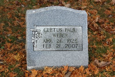 cto | Weber, Cletus P. | NC-08-11 | 26-Apr-1915 | 21 Feb 2007 | Bernice Hoffman Denzin | 10 Jun 1967 | Frank & Elizabeth (Elfert) Weber | |