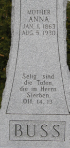 c | Buss, Anna "Mother" | Jan 1 1863 | Aug 5 1930 | b. Pommern, Germany | Albert Buss | ||